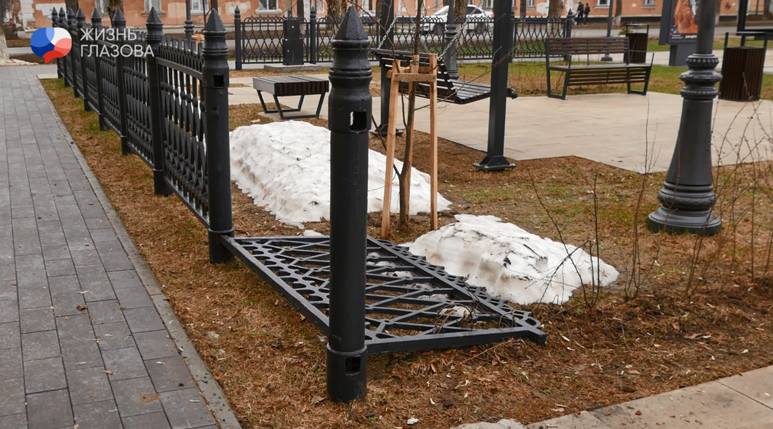 Кованый забор на обновленной Театральной площади в Глазове не пережил зиму. На это внимание главы города в его соцсетях обратил один из жителей города. Уже несколько пролетов ограждения покосились или вовсе лежат на земле.